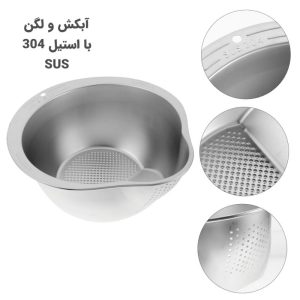 جنس: استیل 304 آمریکا با گرید غذایی SUS ابعاد: طول 27 عرض 24 ارتفاع 12 CM مناسب: آبکش: برنج، ماکارونی، خاباندن سبزیو میوه و برنج در آب و ضد عفونی کردنشان و سپس آبکش کردن به راحتی رنگ طلایی